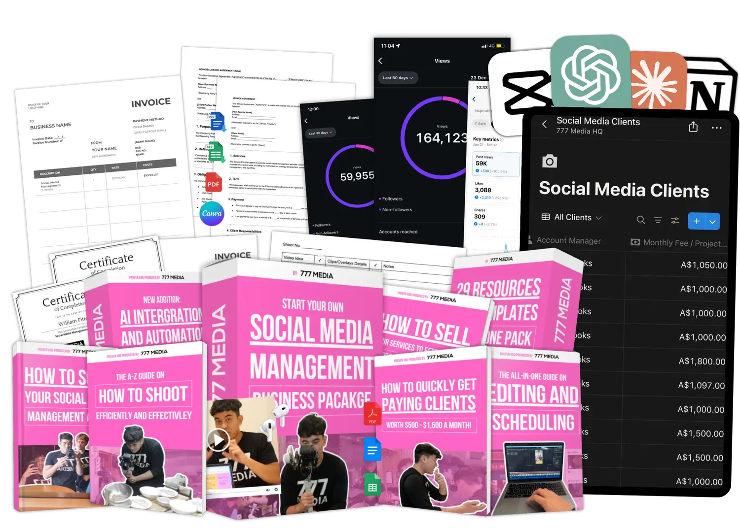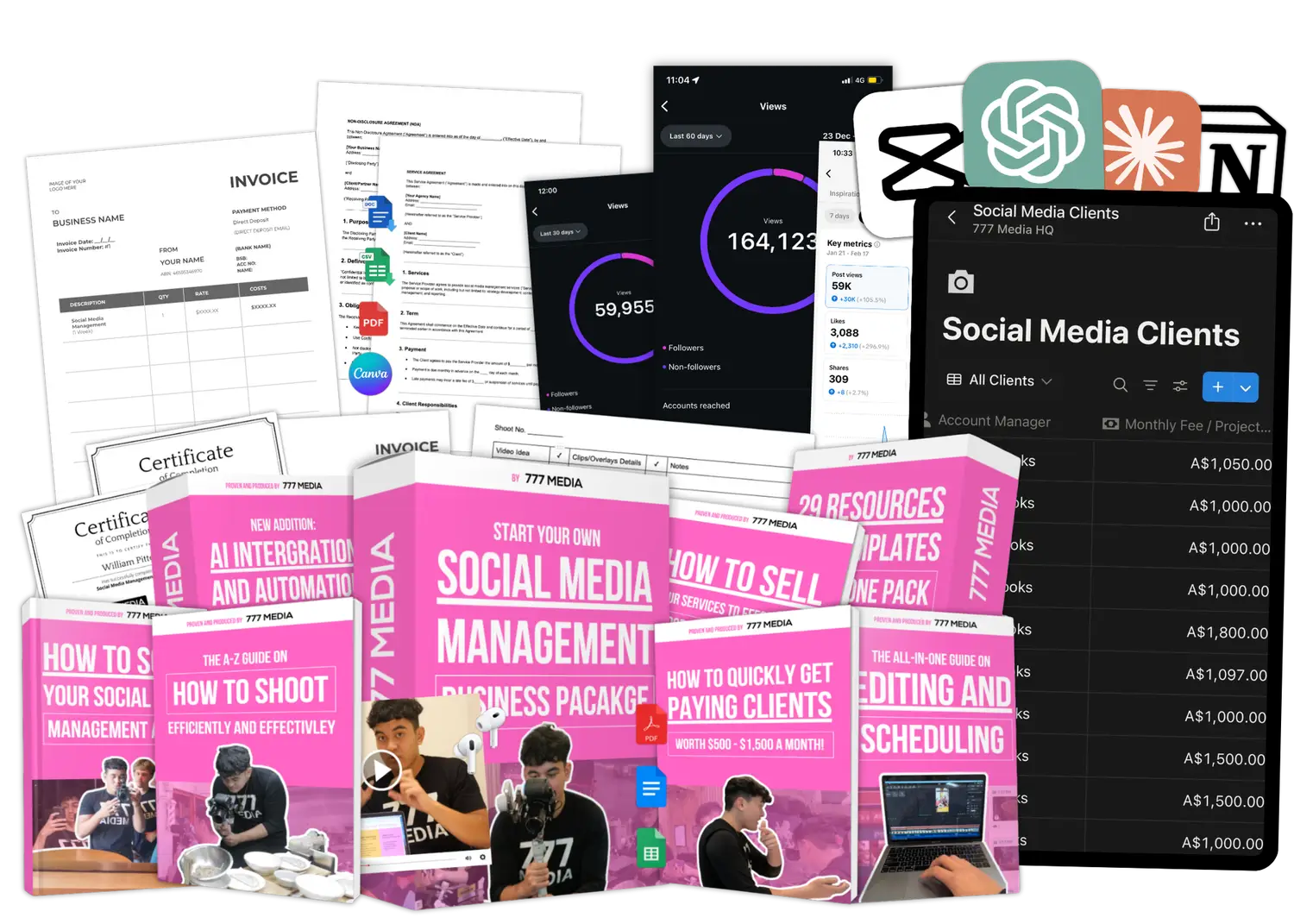 You get a complete step-by-step system to launch and grow your own social media management agency — including templates, training modules, client outreach scripts, contracts, content calendars, and more. Everything you need to get started and win clients fast.